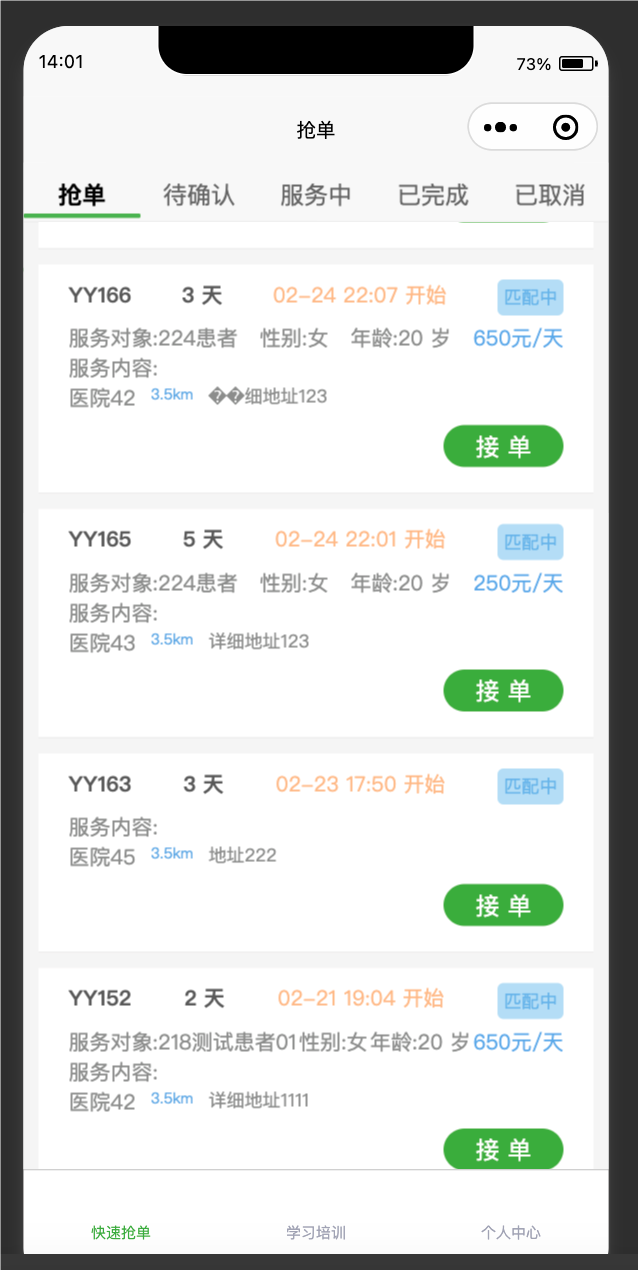 护工端,抢单模块,可以抢单、跟进自己的订单服务
